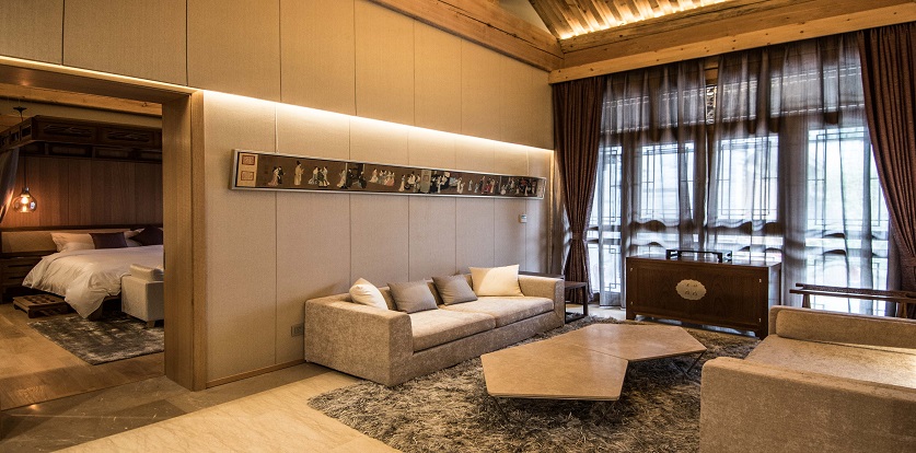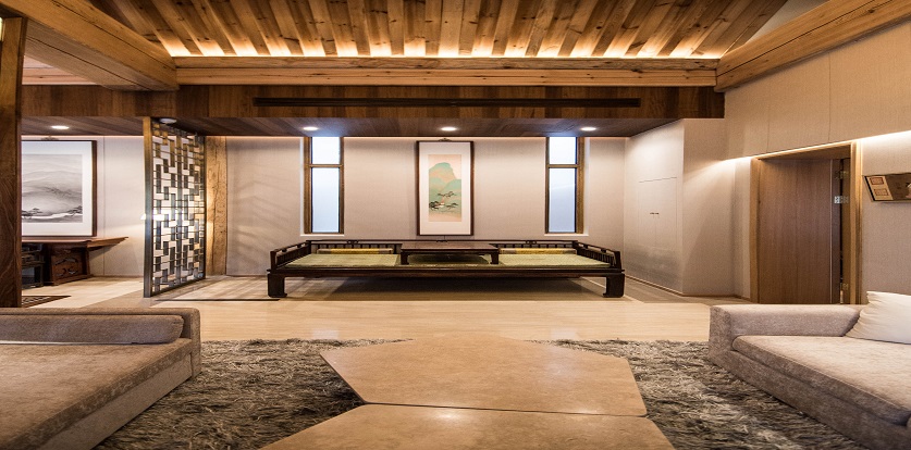 項目結(jié)合了中西方傳統(tǒng)和現(xiàn)代藝術(shù)。起居室的靈感源于幽靜的山脈,既有中式家具的運(yùn)用,又不乏現(xiàn)代感。